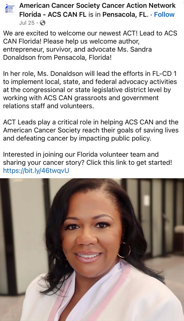 Sandra Donaldson MPA, MBA was recently appointed as the Florida District 1 Congressional lead for the American Cancer Society! As a two-time breast cancer survivor, Sandra values the respect for health, community and quality of life.
